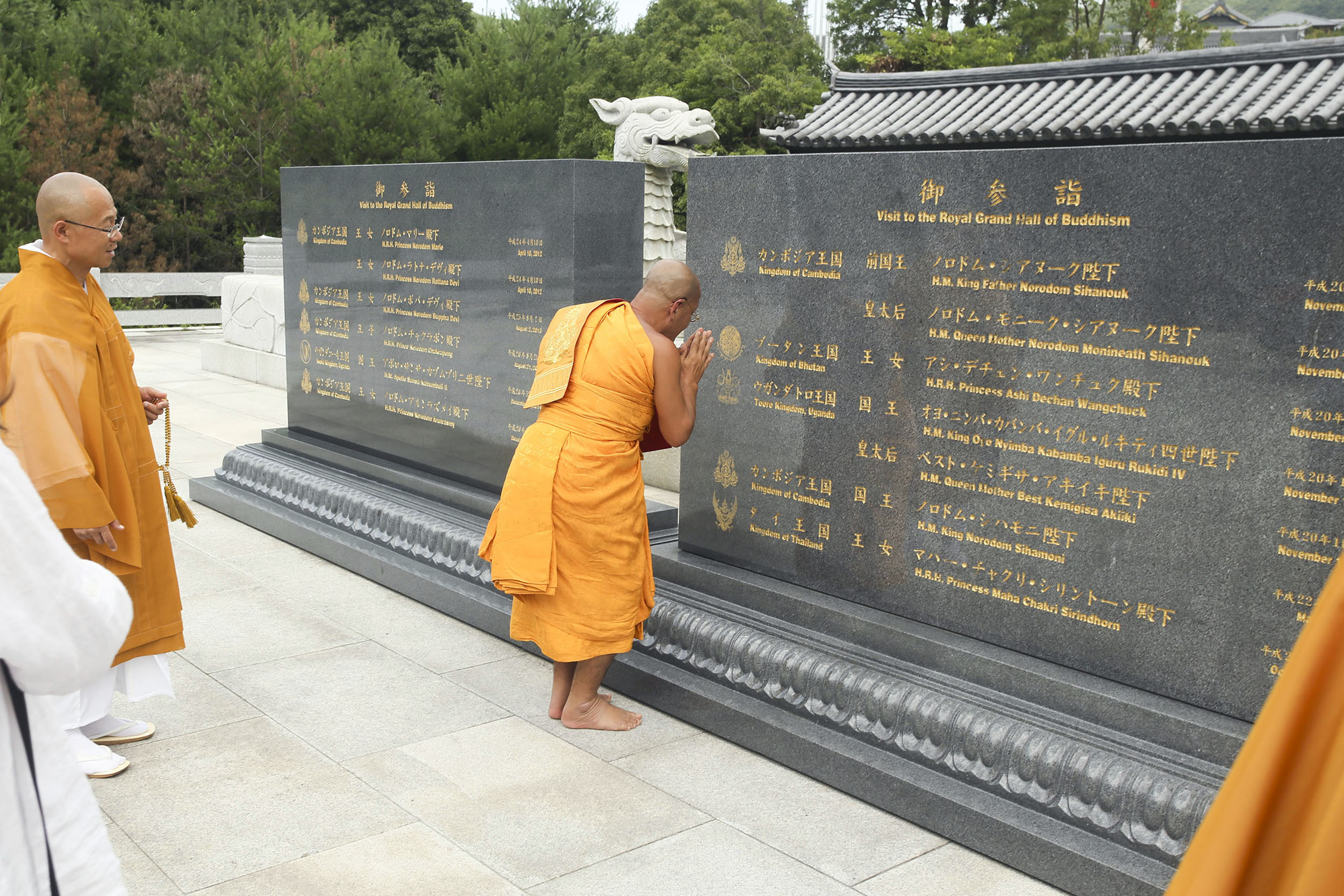 カンボジア王国 故ノロドム・シアヌーク陛下 モニーク皇太后陛下 シハモニ国王陛下 並びに 王室の方々の御参詣を刻む石碑に合掌される