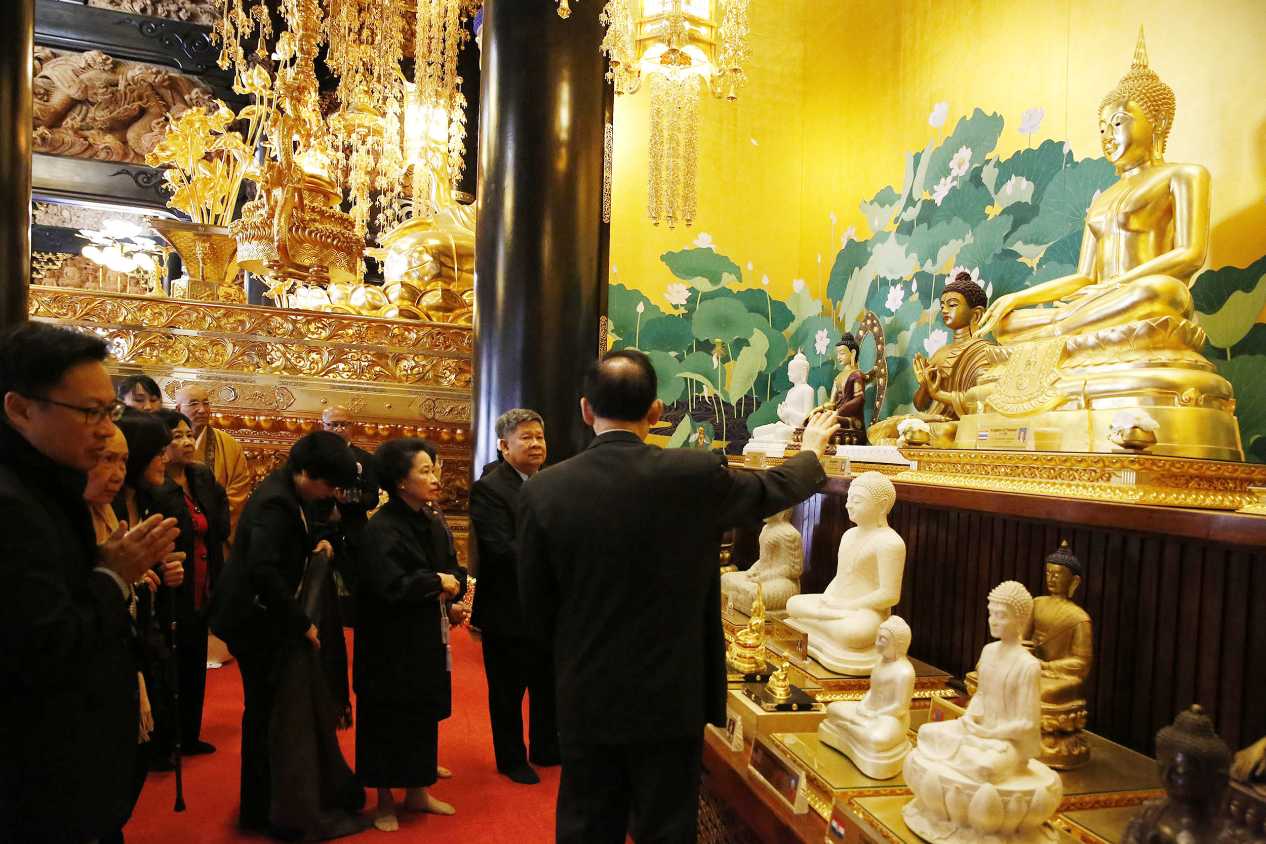 釈迦堂にて 全世界五大陸の仏教最高指導者から奉納された奉納仏を間近でご覧になり 感動される御一行