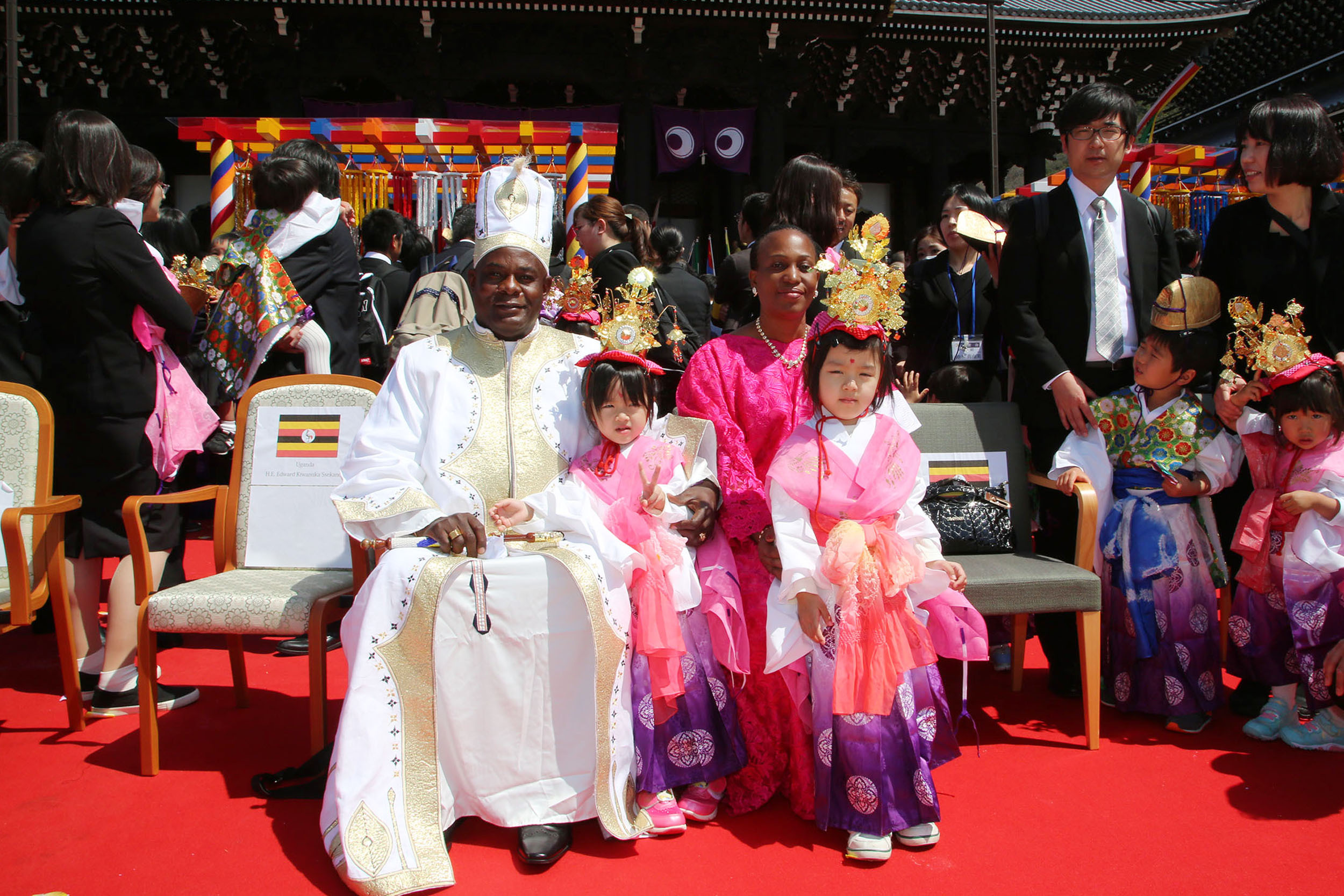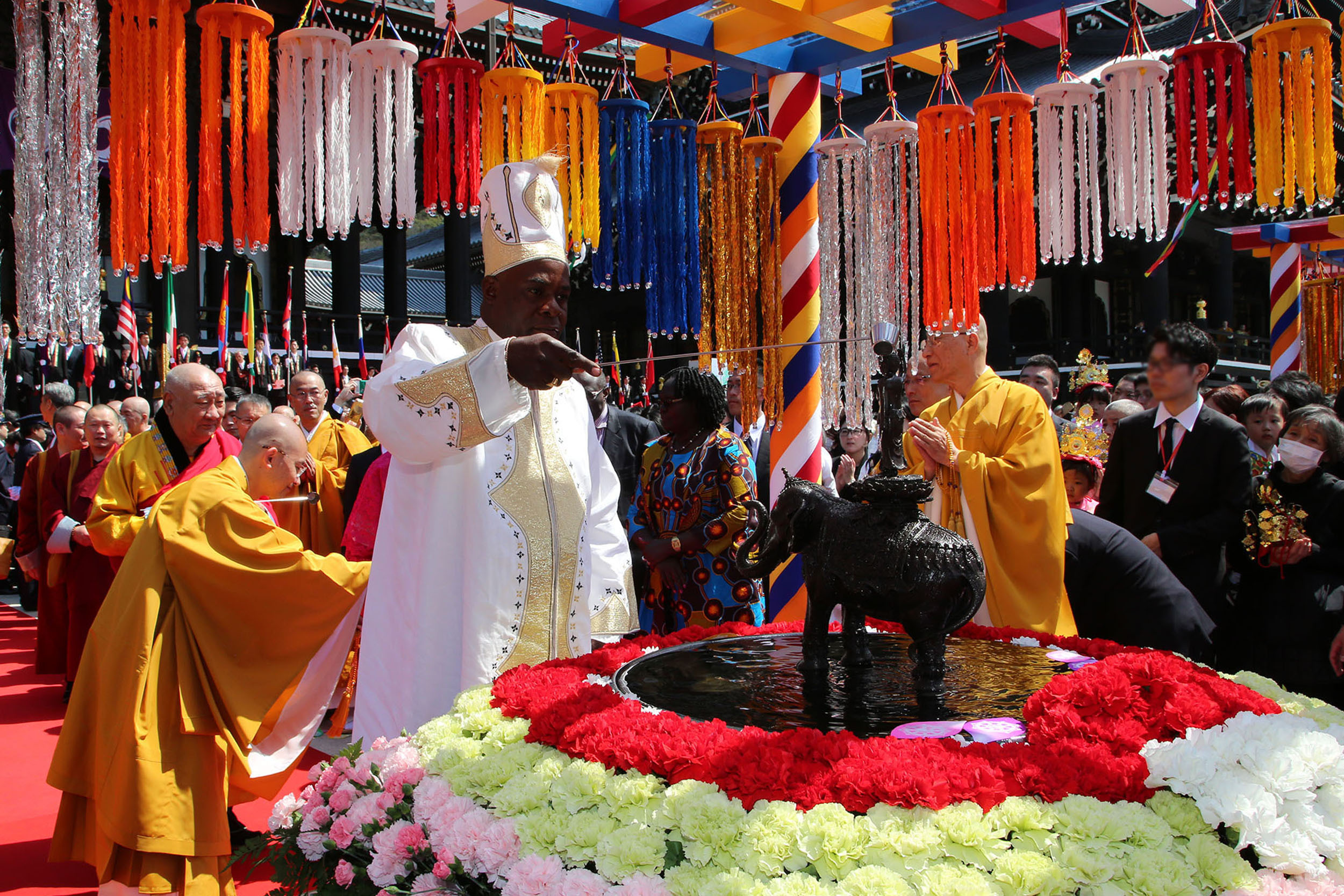 誕生仏にお水かけ供養をされる コーキ王国国王陛下