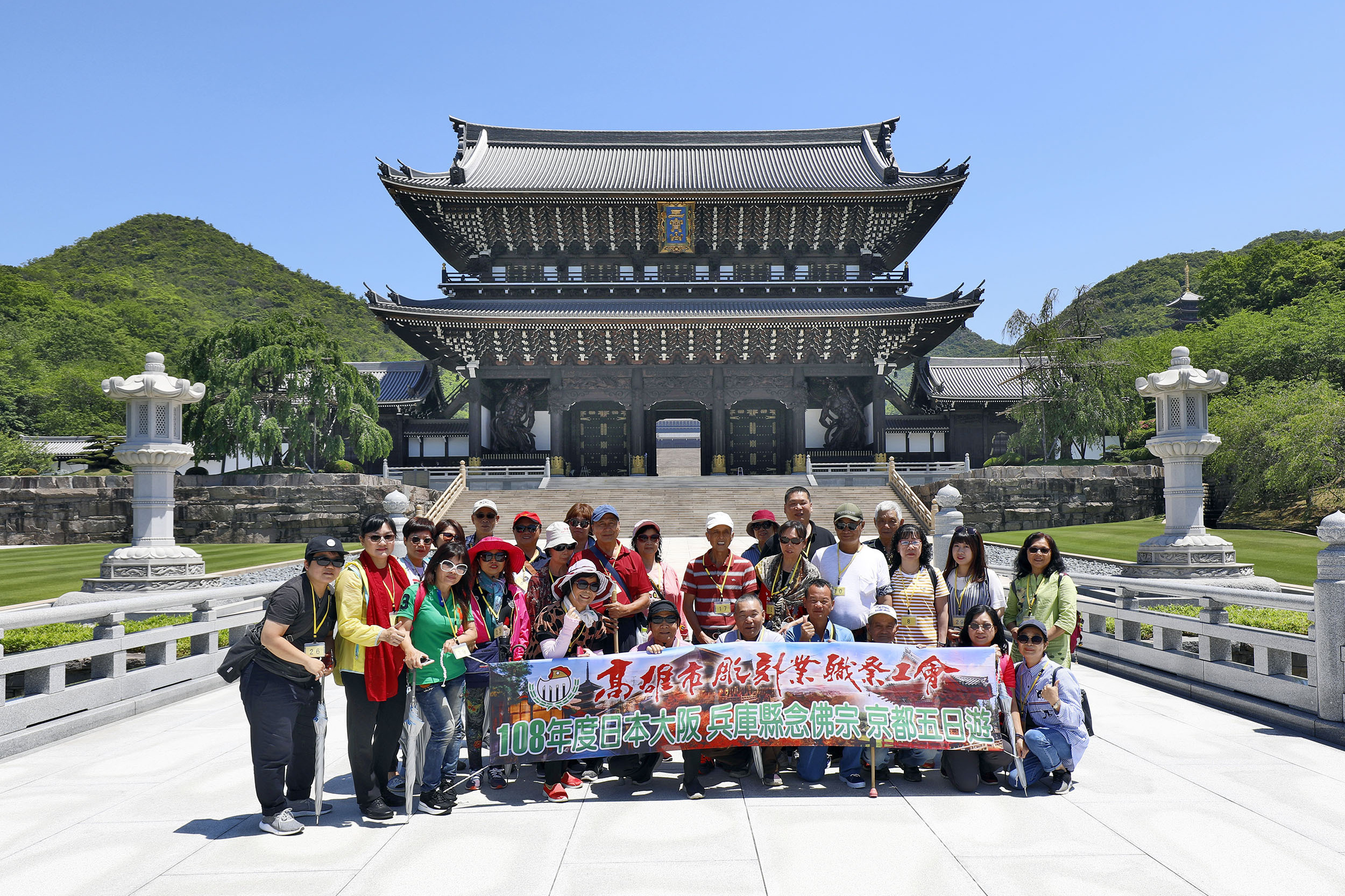 青空のもと 山門前 真如橋にて 記念撮影