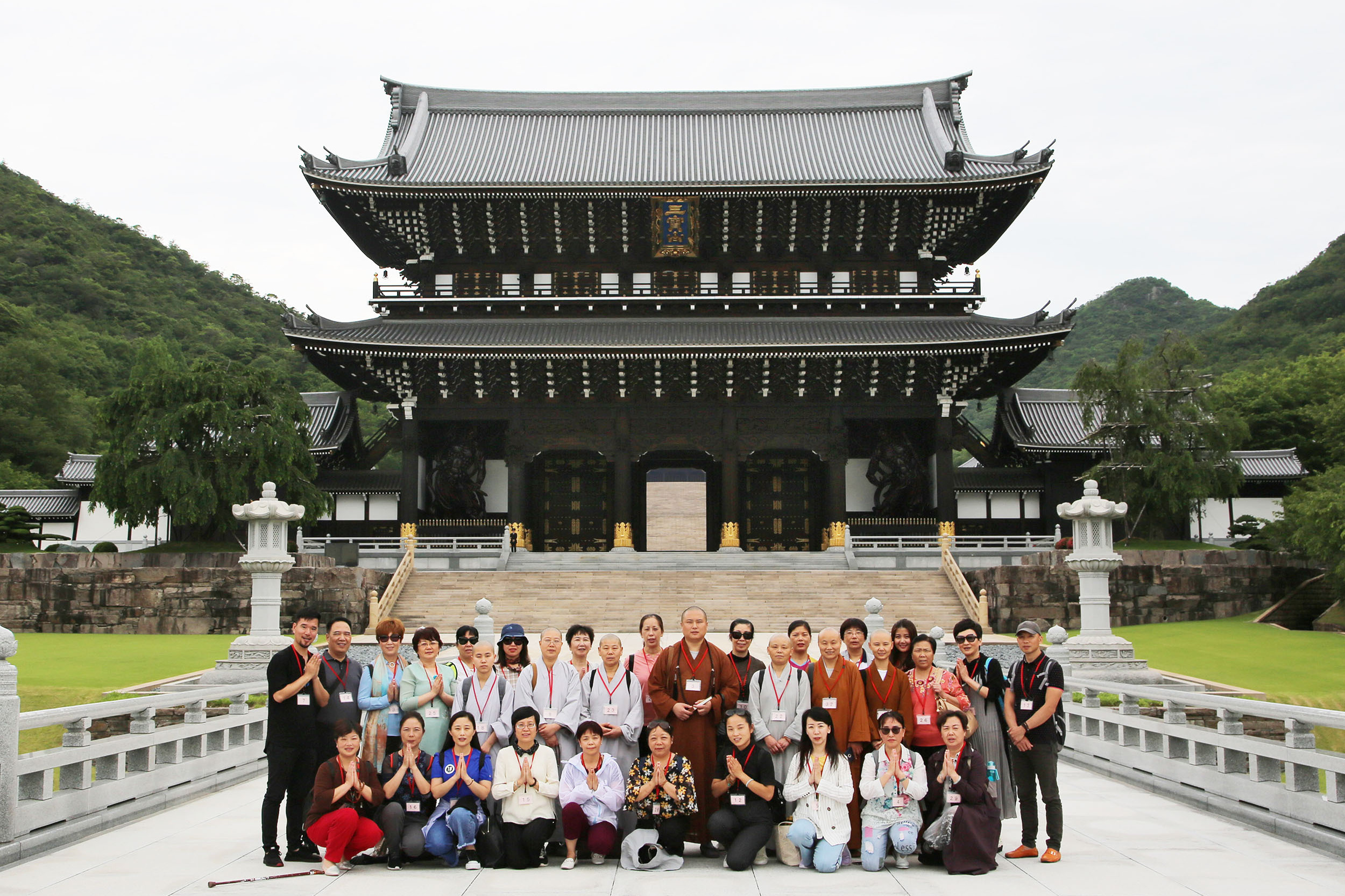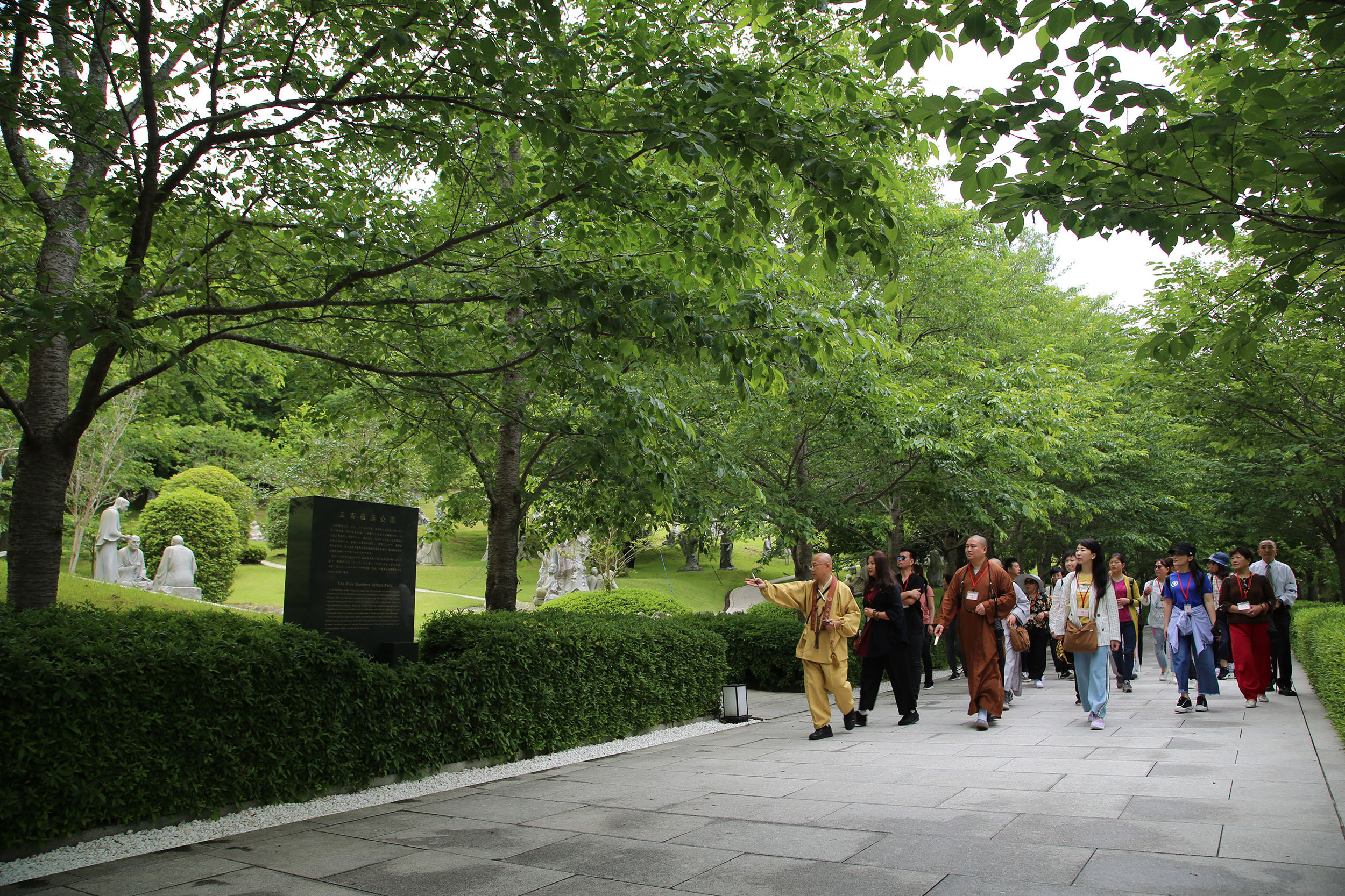 緑生い茂る桜のトンネルを歩み、五百羅漢公園を眺めつつ境内へ向かう中国御一行