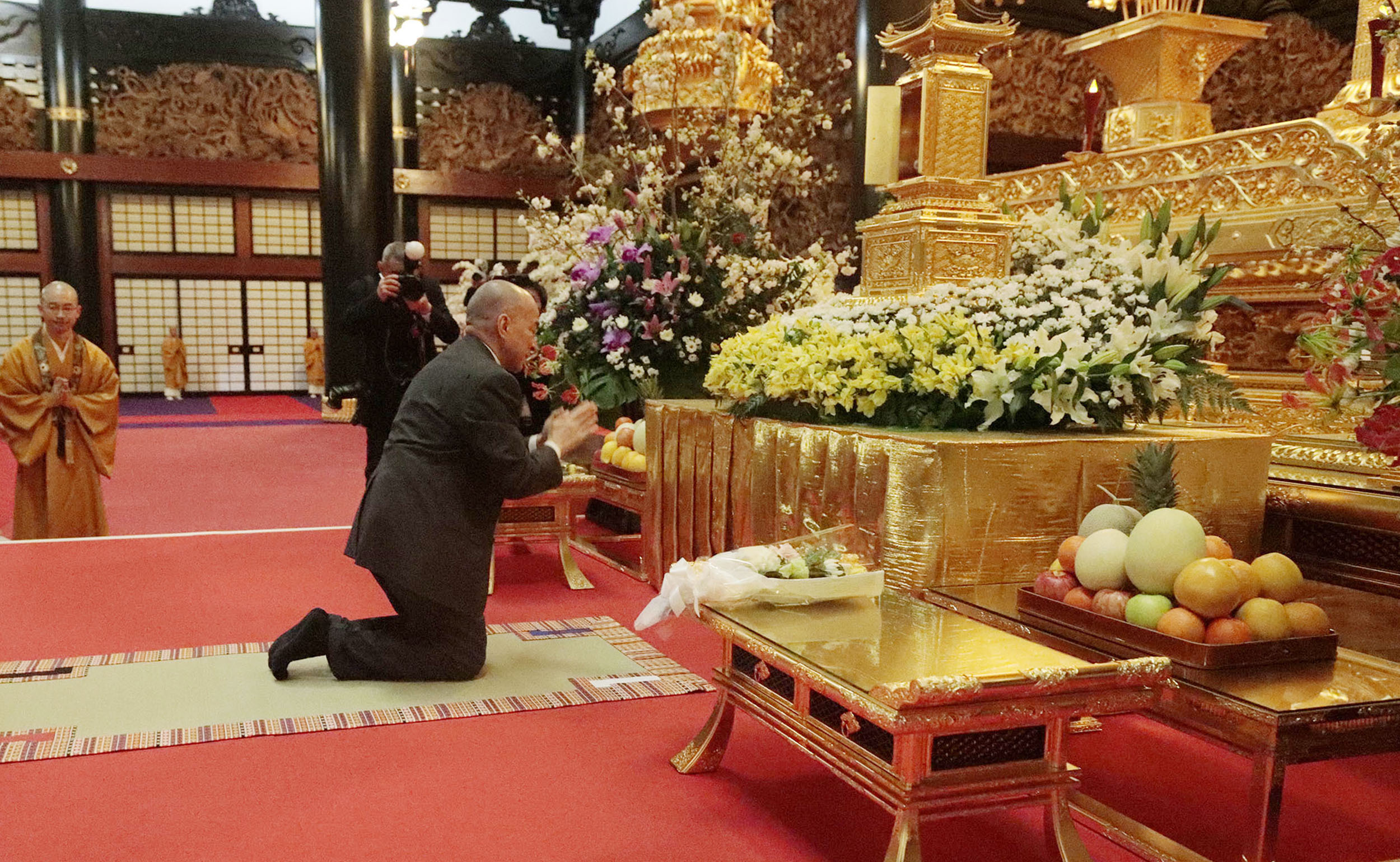 「佛教之王堂」念佛宗総本山 本堂に到着された シハモニ国王陛下 哀悼の意を込めて
